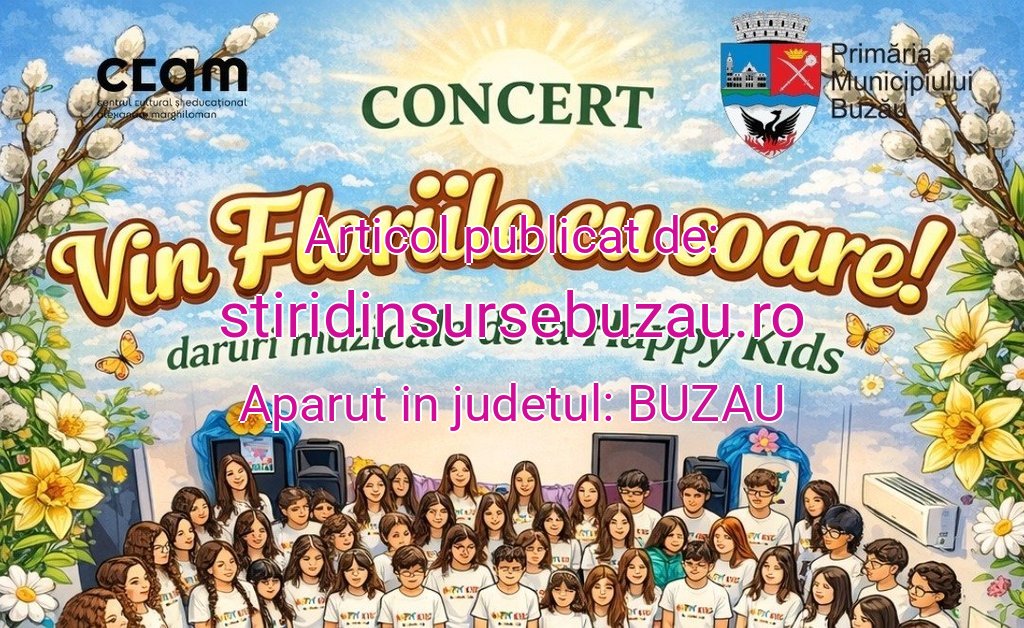 Primăria Municipiului Buzău și Centrul Cultural și Educațional „Alexandru Marghiloman” îi invită pe buzoieni să ia parte la un eveniment dedicat sărbătorii Floriilor. Concertul intitulat „Vin Floriile cu Soare” va avea loc pe 5 martie 2026, începând cu ora 17:00, la Centrul Cultural „Iazul Morilor”, situat pe strada Frăsinet.